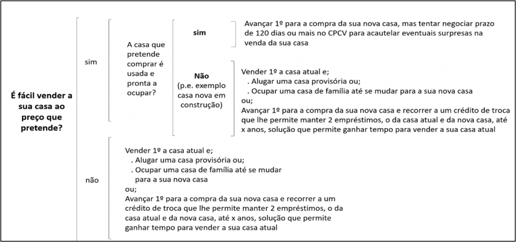 Para apoiar o comprador neste dilema, sublinha-se que existe um ou mais bancos que podem proporcionar o crédito “troca de casa” ou equivalente que possibilitará a aquisição de uma nova casa e acumular o crédito desta com o crédito da atual, por um ou mais anos, isto desde que, obviamente, o comprador tenha uma situação financeira que lhe permita suportar a prestação da sua nova casa, mais os juros da casa atual.