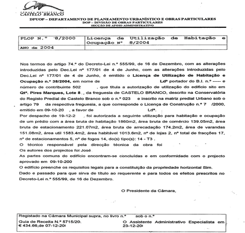 Este documento é emitido pela Camara Municipal que licenciou o imóvel. É obrigatório para todos os imóveis construídos após 1951, e cujo Regime Geral das Edificações Urbanas (RGEU) seja aplicável na data de construção no respetivo concelho.