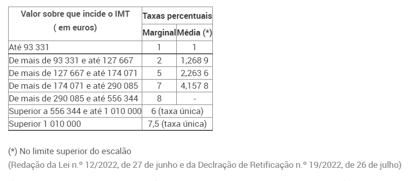 Tabela de IMT para aquisição de habitação própria permanente: